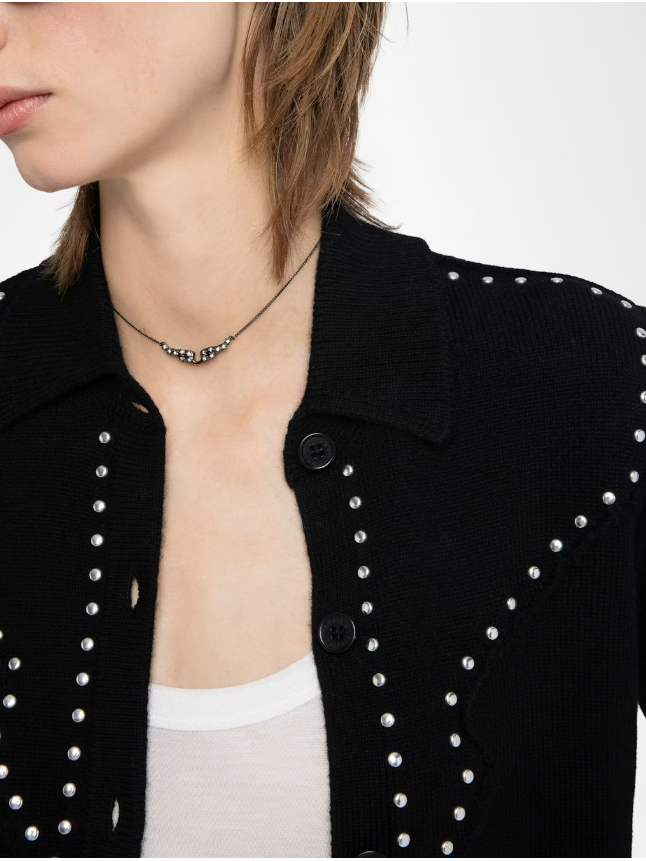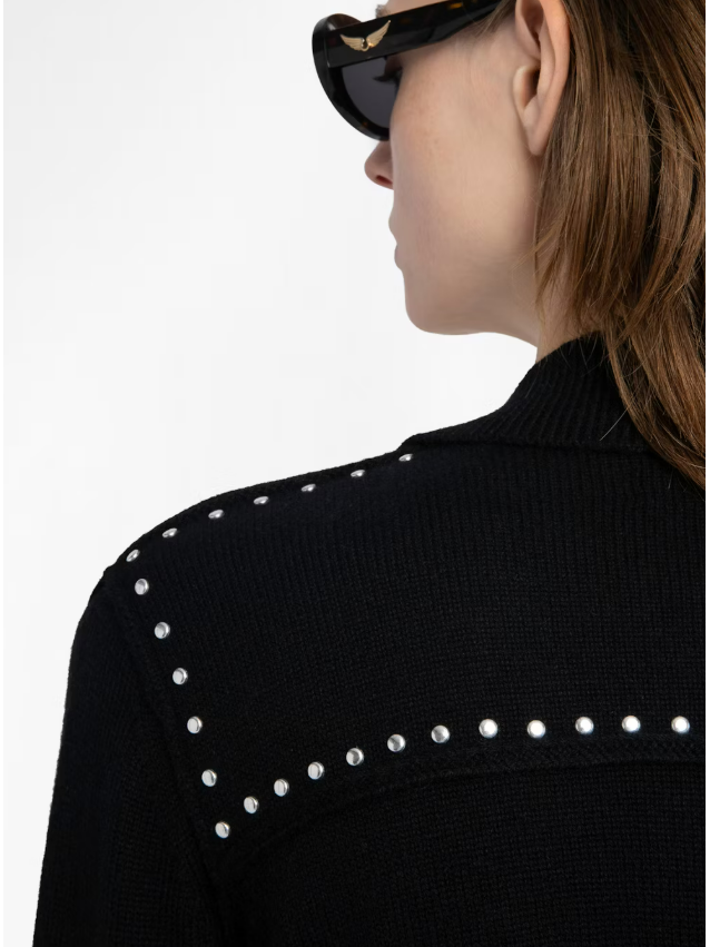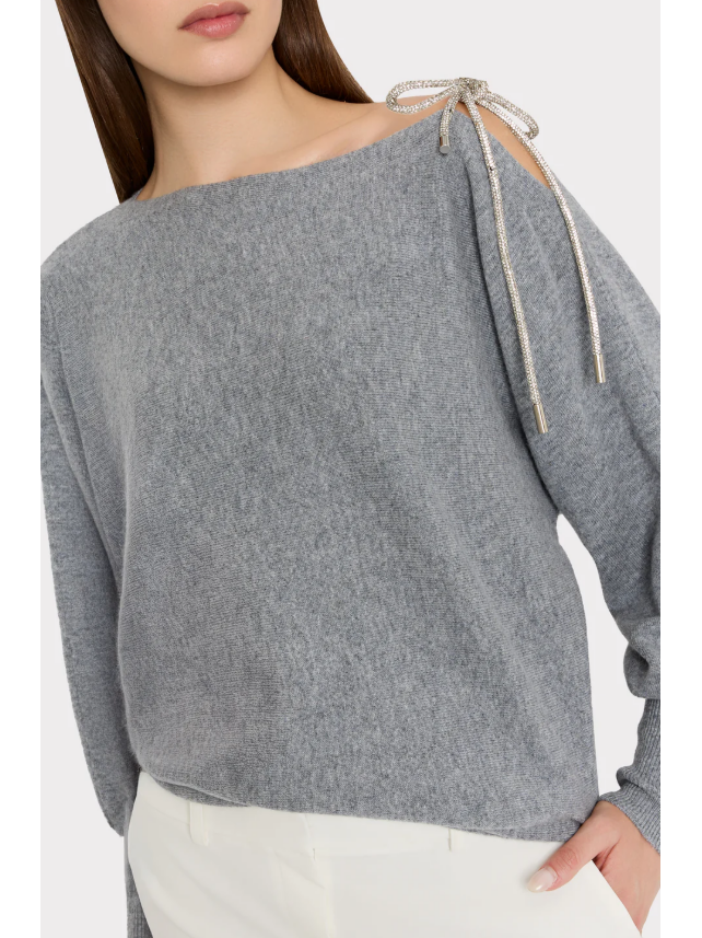 A charcoal gray crew neck is adorned with silver metal trim from the shoulders to split cuffs