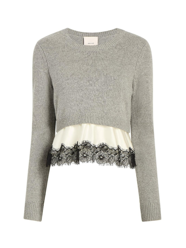 The Show & Tell sweater features cut out shoulders and unique black stitch detailing on the sleeves