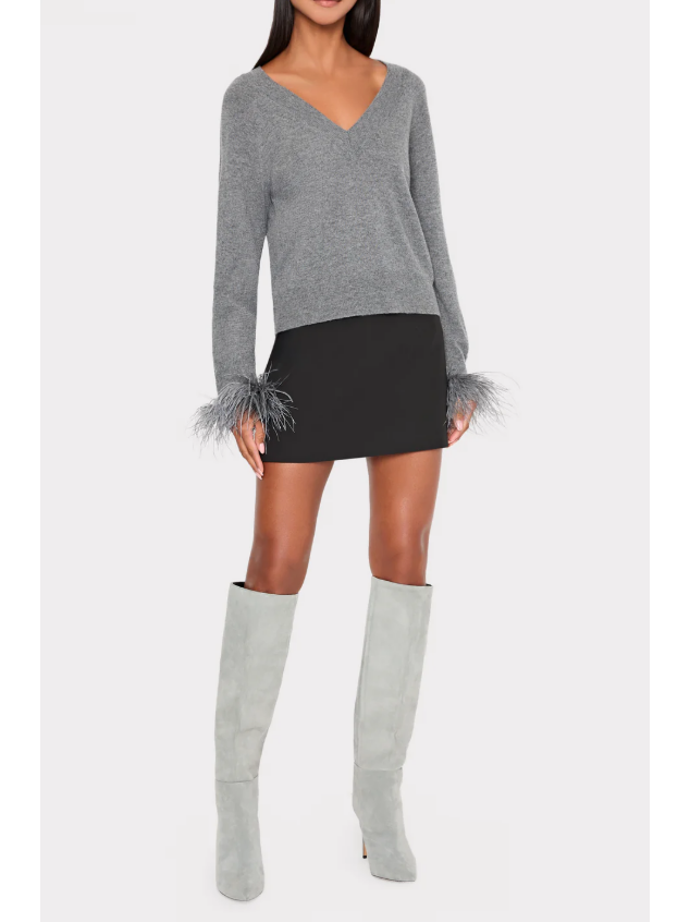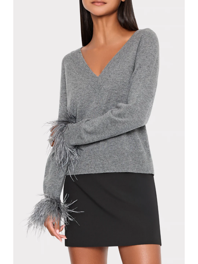 This luxe, relaxed fit sweater is embellished with feather detail at the sleeves