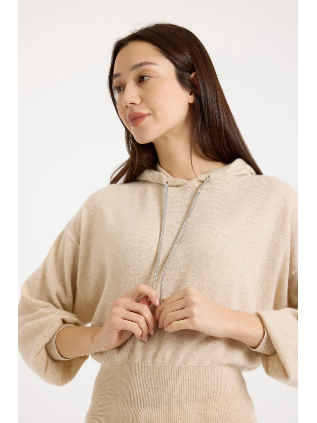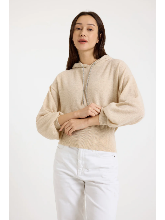 This relaxed-fit cashmere hoodie has a very unique feature - the drawstring pulls are crafted of rhinestones in rose gold