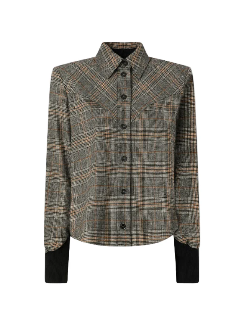 Long-sleeved shirt/jacket with structured shoulders, classic collar, front button placket, and front and rear yoke detail