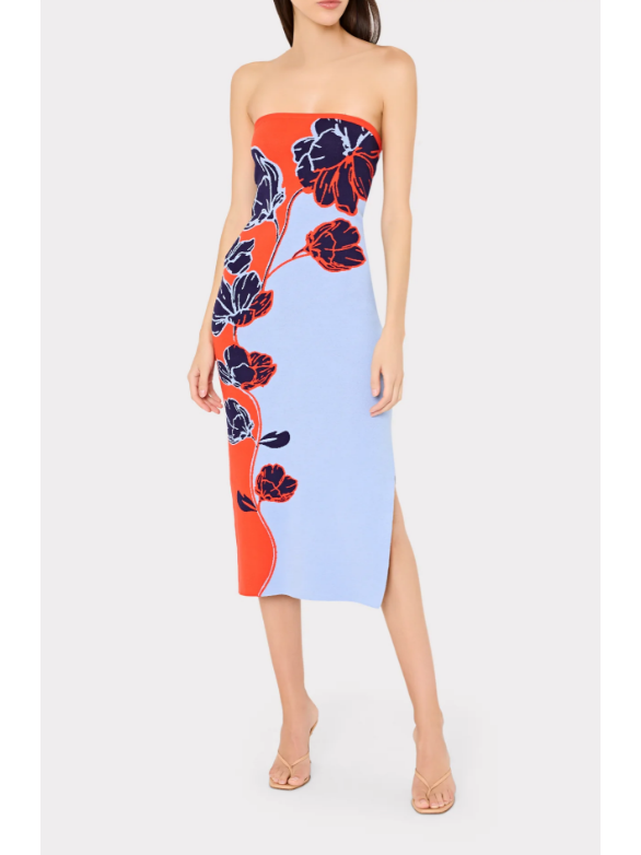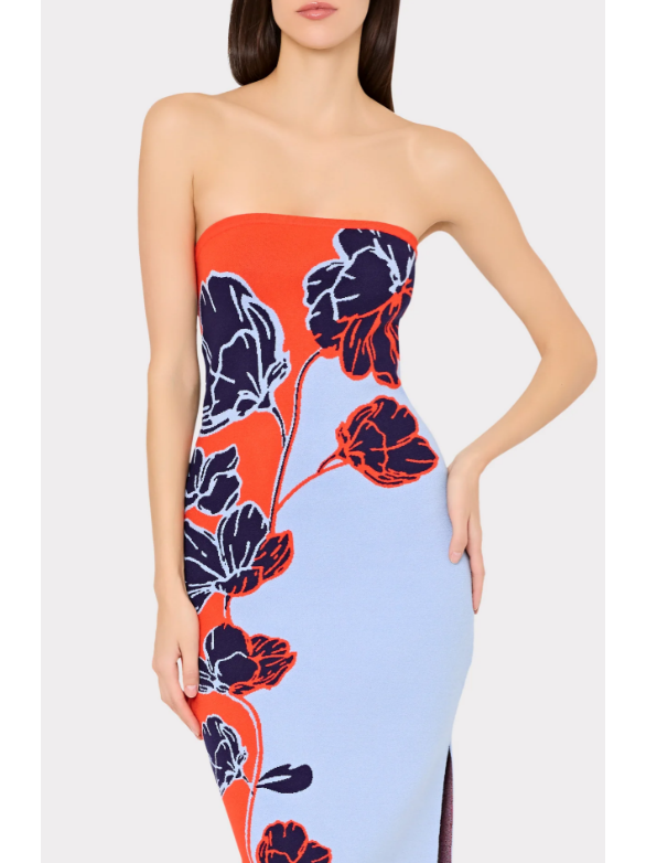 Cut from Milly's signature knitwear, this strapless, body-skimming silhouette falls to a midi length and is finished with a dramatic side slit for movement